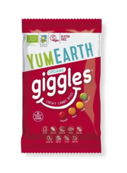 Yumearth vegan pehmed dražeekommid (Giggles), valmistatud päris mahlakontsentraadist! Assortii, kus on neli maitset - maasikas, apelsin, sidrun ja õun.