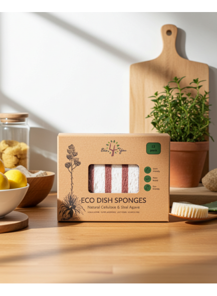 Our eco sponge is crafted from wood pulp and long lasting natural fiber and comes in a 100% recycled unbleached Kraft box. The sponge side is made of 100% biodegradable and compostable wood cellulose, a soft material with high water absorbing ability. The scrub side contains a premium blend of Sisal (Agave) fiber and recycled polyester adhesive. Ergonomically designed S-shape for comfortable hand grip and easy scrubbing. Perfect for the kitchen and bathroom, safe to use for delicate glasses, stainless steel, non-stick cookware, ceramic surfaces and much more. Washable up to 60°C. Wash before using. After each use, rinse with water and air-dry. When it´s time to dispose, separate the two halves; compost the yellow sponge and dispose of the scrubber.