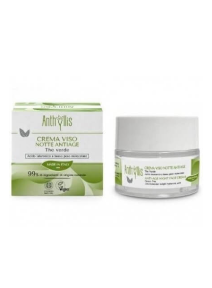 La Crema viso notte antiage della svolge un'azione anti age grazie alla presenza di acido ialuronico vegetale a basso peso molecolare che agisce in profondità sulla pelle favorendo i processi rigenerativi durante la notte. L'epidermide è nutrita dal burro di karitè Biologico. La crema contiene anche l'estratto glicerico di The Verde Biologico dalle spiccate proprietà antiossidanti. 99% origine naturale sul totale. Testata dermatologicamente su pelli sensibili.
