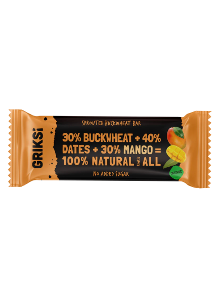 Ingredients: dates*, sprouted dried buckwheat* 30%, mango*.